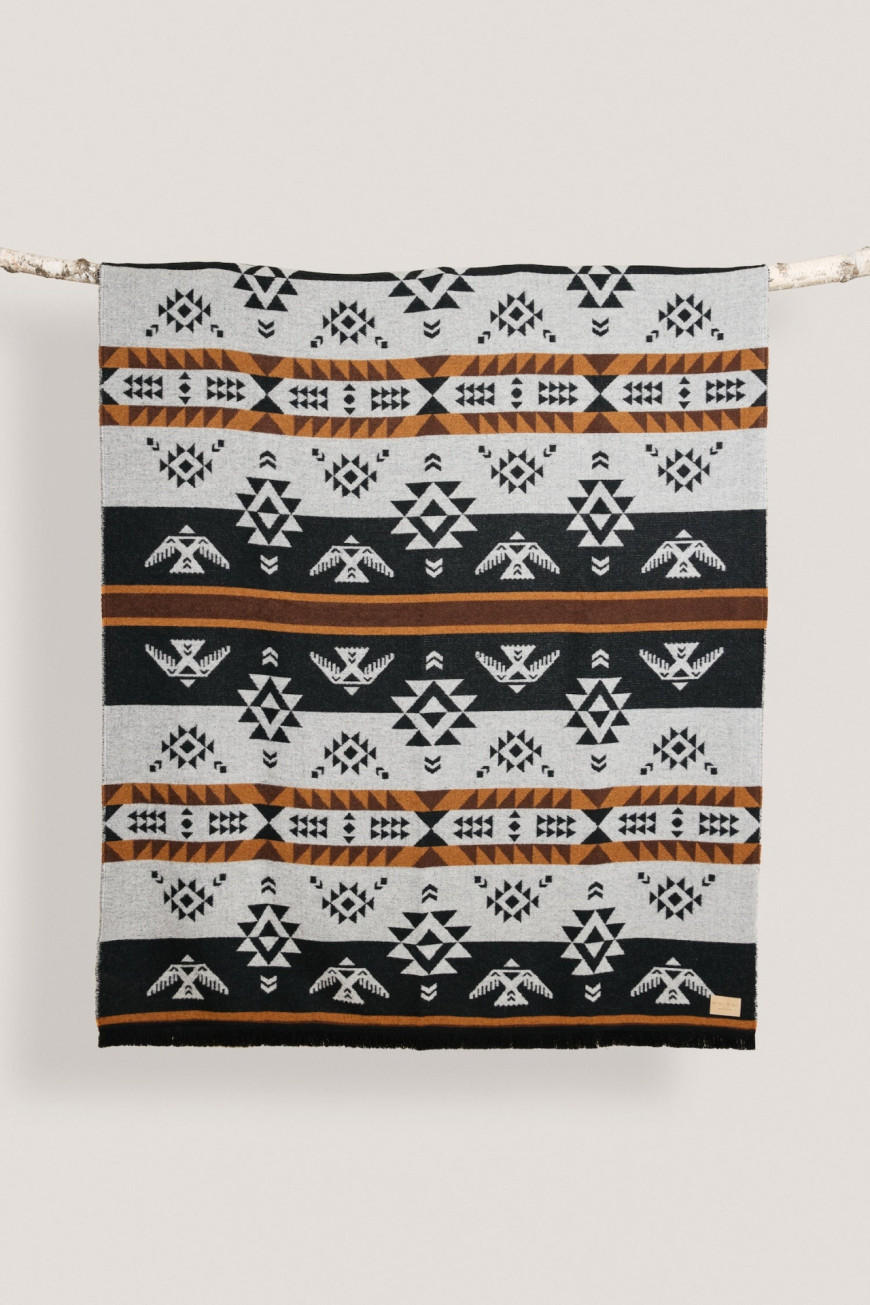 The Thunderbird Indigenous Blanket is made of a perfect soft and warm blend of 20% recycled wool, 30% acrylic, 50% recycled polyester. Come see in our family-run showroom here in Edmonton.